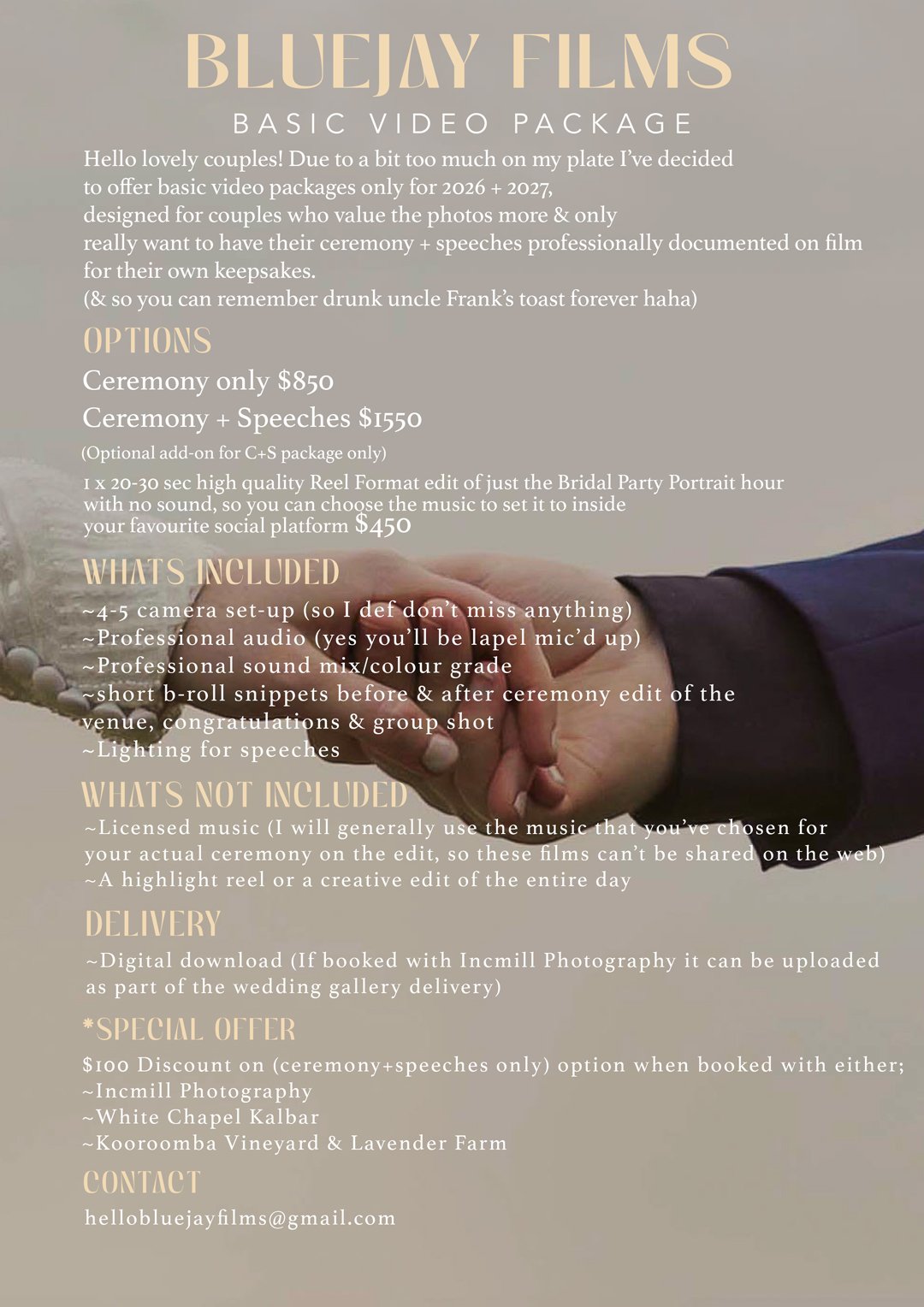 *bonus $100 off my C+S package when you book with Incmill Photography/ White Chapel Kalbar venue/ or Kooroomba Vineyard & Lavender Farm venue!